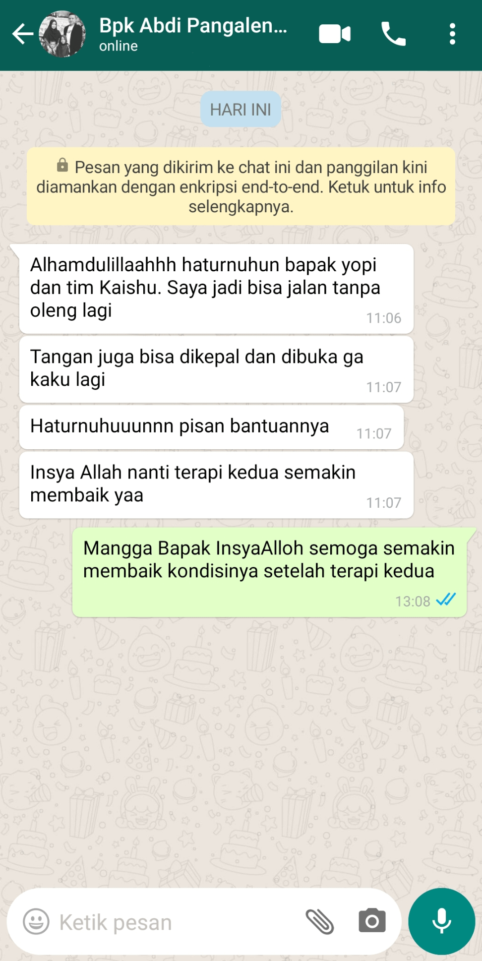 Tujuan kami membantu mengembalikan dan mempertahankan kesehatan tulang belakang dan syaraf Anda tanpa operasi. Sehingga Anda menikmati hidup Anda jauh dari rasa sakit dan kekhawatiran akan operasi. Dengan teknik terapi neurotik Kaishu yang terbukti selama bertahun-tahun menyembuhkan penyakit syaraf, tulang belakang, stroke, syaraf kejepit, lumbar backpain, dan masalah lainnya di tubuh Anda.